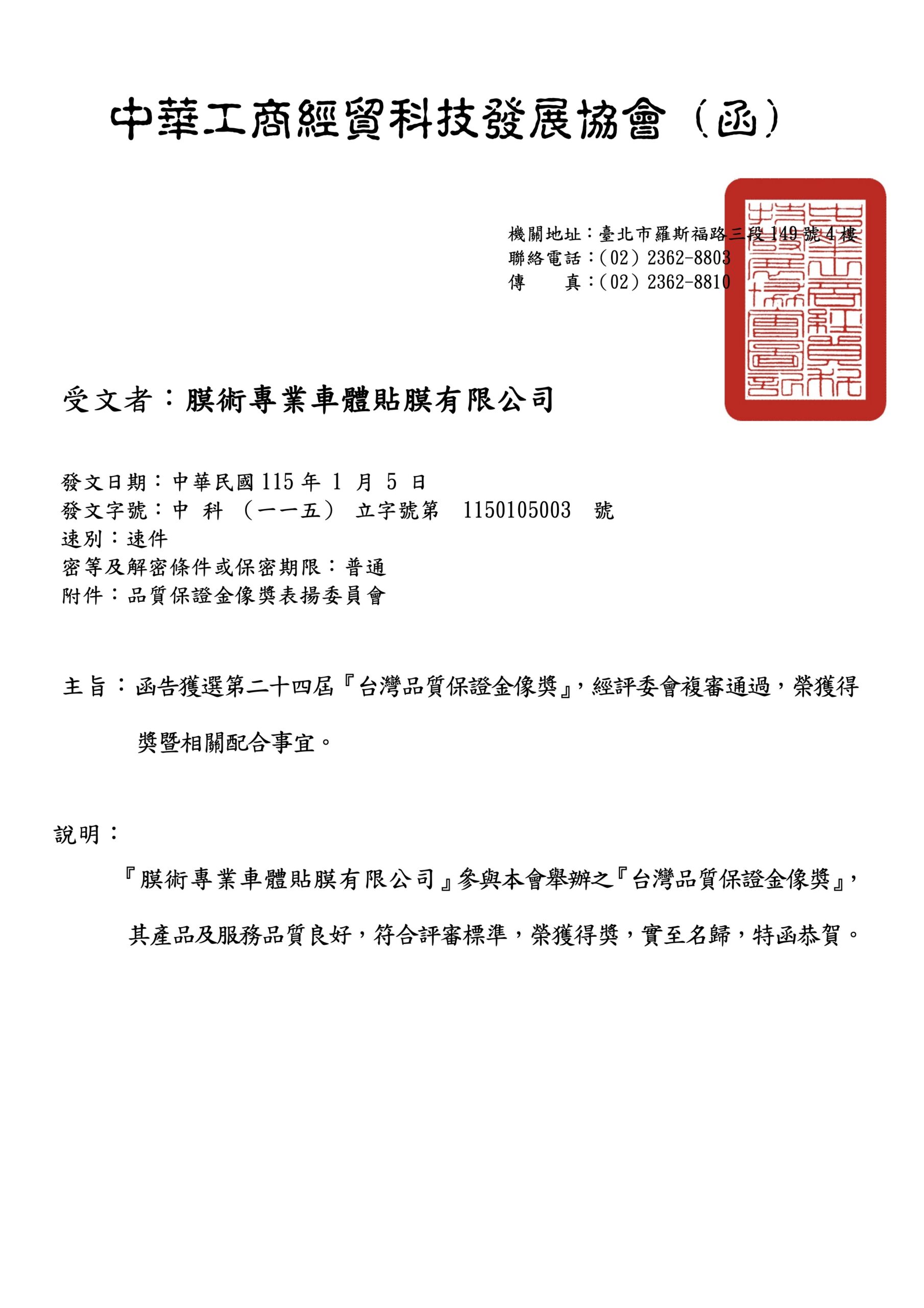 台灣品質保證金像獎獲獎通知